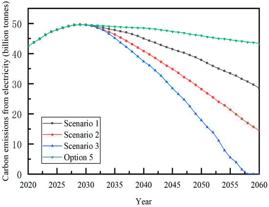 Figure 5 shows that electricity carbon emissions peak in Options 3, 4, and 5, while the carbon emissions from the other two systems increase. For baseline Scenario 3, carbon emissions from electricity peak in 2035 at 5.01857 billion tons, later than the expected 2030. Options 4 and 5 reach carbon peaks in 2030 and 2029, respectively, with peaks of 4.98786 and 4.95774 billion tons. Further analysis shows that there is little difference between the peaks of Option 4 and Option 5, but the peak time of Option 5 is earlier compared to Option 4. It shows that if the economic GDP growth rate is controlled below 7%, by controlling the proportion of thermal power generation, adjusting the energy power generation structure, and using low-carbon energy-saving technologies to reduce coal consumption for power supply under scientific and technological progress and innovation, the power sector can achieve “30–60 dual carbon emissions”.