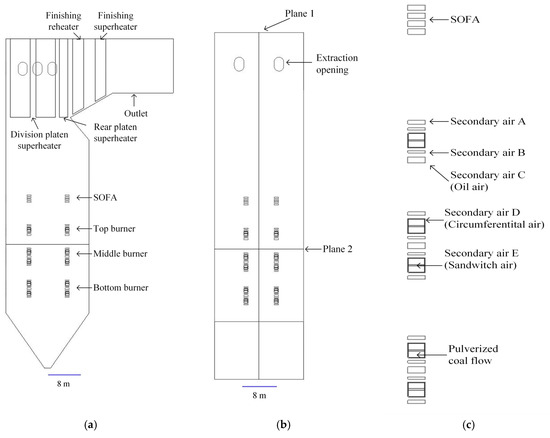 This numerical model was developed based on Ansys Fluent 2022 R1. The mass conservation equation, energy conservation equation, and momentum equation have been considered comprehensively in the solver [30]. The Discrete-Ordinates (DO) model was employed as the radiation model. The realizable k-ε model (2 equations) was employed to calculate turbulence in this study. This model has been extensively validated for a variety of flows and significantly outperforms the standard model [31]. To calculate the chemical reaction in the combustion process, the species transport model in the species model, which can simulate the interaction between the components of the fluid mixture or with other phases, was employed and the volumetric reaction was set [30]. The two-competing-rates model and the kinetics/diffusion-limited model were used to model the devolatilization and combustion of coal particles, respectively. By activating the two corresponding models in Fluent, the calculations on the generation of thermal and fuel nitrogen oxides (NOx) were performed. Meanwhile, the discrete phase model (DPM) should be set to simulate the coupling between the fluid and the discrete phase (pulverized coal particles). During the calculation, one DPM iteration would be performed after every 30 iterations of flow field. Two planes (Plane 1 and Plane 2) are labeled in Figure 1. The convergence conditions were that the average temperature changes of these two planes are both less than 0.1% within fifty iteration intervals.