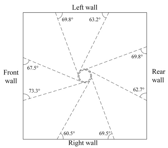 The burners comprise three levels, with the top burners comprising a single layer of burner nozzles and the middle and bottom consisting of two layers of burner nozzles. In addition to the burner nozzles, each layer of the burner is equipped with multiple secondary air nozzles. These secondary air nozzles can be categorized into five different groups based on their shape and position, as illustrated in Figure 1c. In addition, there are four layers of separated over-fire air (SOFA) nozzles above the top burners. To facilitate the combustion process, eight columns of burner nozzles and auxiliary air nozzles are arranged on the water-cooled wall, with two columns on each of the four walls. The mixture of pulverized coal and auxiliary air enters the furnace at a specific angle and forms a tangential circle in the central region of the boiler, as shown in Figure 2.
