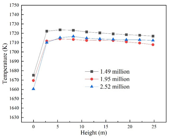 Temperature distribution of primary combustion zone along height direction under different grid numbers.