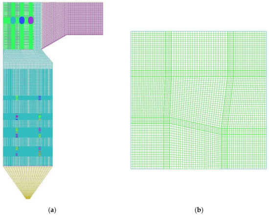 Ansys ICEM CFD 2022 R1 software was employed for mesh generation in this study. To account for the structural characteristics of different areas, the boiler was initially divided into distinct blocks, with each block generating its own mesh. Interfaces between blocks were established to facilitate the transmission of information. All grids employed in this study were hexahedral structured grids, with the qualities consistently above 0.7.