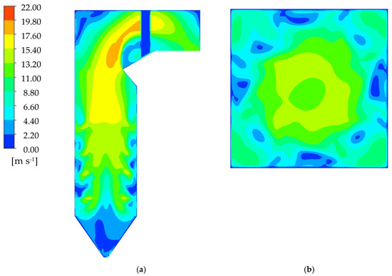 Figure 5 shows the flow field of the longitudinal section in the center of the boiler (Plane 1 in Figure 1) and the cross-section above the middle burner (Plane 2 in Figure 1) when w = 0. As can be seen from Figure 5b, the air flow forms a regular circle pattern in the middle of the boiler. In the lower region of the primary combustion zone, the air flow mainly rotates near the boiler wall, resulting in a velocity distribution pattern characterized by high velocities around the periphery and lower velocities towards the center. In the middle and upper part of the boiler, as the air inflow increases, the extent of the tangential circle expands continuously, while the speed in the central region begins to surpass that of the surrounding flow. In the primary combustion zone, the average flue gas velocity rises with height. When the flue gas flows through the furnace arch into the horizontal flue, the cross-sectional area of the flow shrinks rapidly. Meanwhile, the furnace arch plays a certain role in disrupting the flow [35]. Therefore, the velocity of the flue gas increases correspondingly.