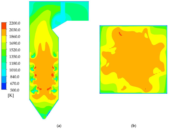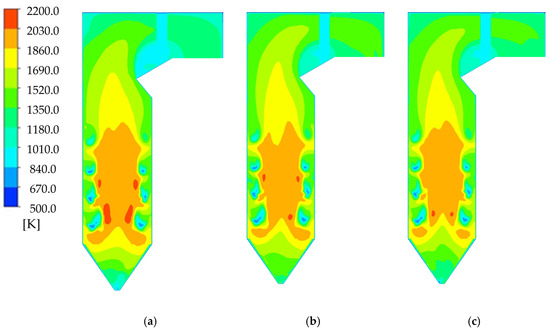 When w = 20%, the temperature level of the furnace continuously decreases as r increases, as shown in Figure 15. When r increases from 0 to 20%, the volume mean temperature of the primary combustion zone decreases from 1600.5 to 1571.2 K. This trend is consistent with the literature [14]. The decrease in temperature can be attributed to the drying effect of the recirculated flue gas on lignite. As a result, the energy density of the lignite entering the furnace surpasses that of the industrial analysis. Therefore, the chemical energy carried by corn straw is relatively low. Consequently, the overall temperature within the furnace drops. Additionally, biomass has a tendency to burn more rapidly compared to lignite, resulting in a shorter distance traveled during combustion. As a result, the temperature in the central area of the boiler experiences a decrease.