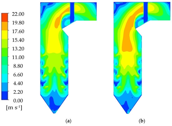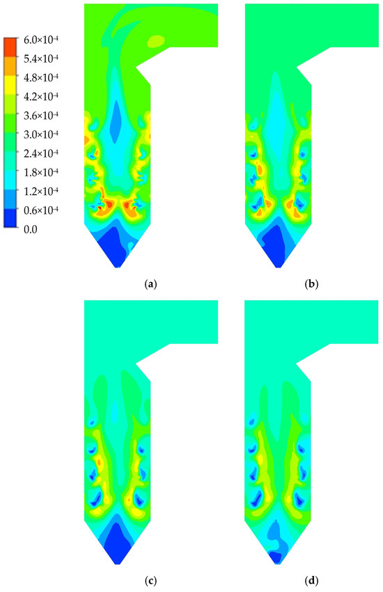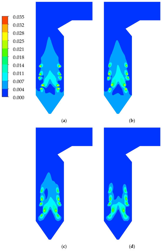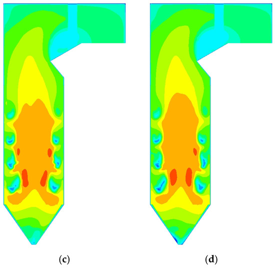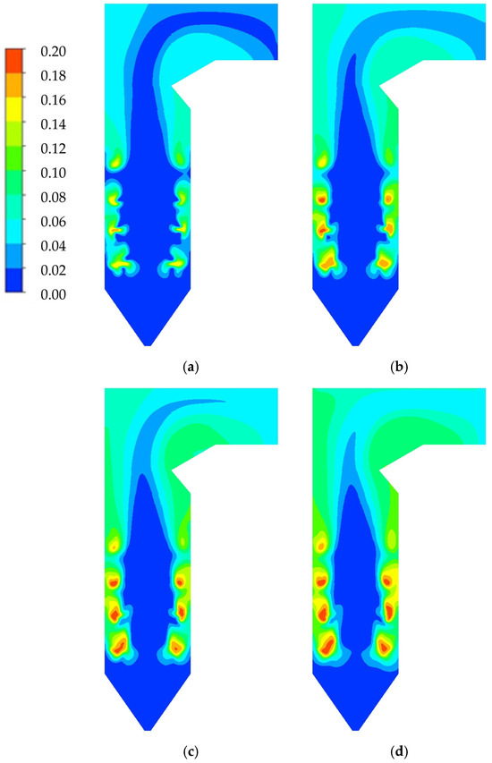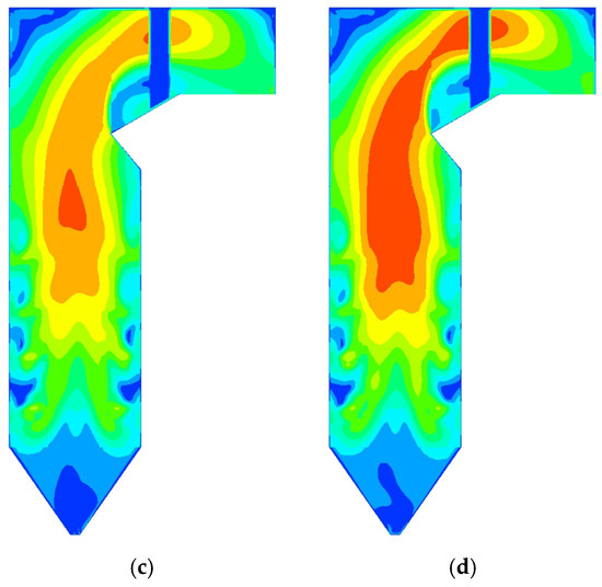 When w = 20% and r increases, the overall shape of the velocity contours in different working conditions remains similar. However, the velocity level slightly decreases, especially in the region above SOFA. This can be attributed to the fact that the ratio of the theoretical flue gas volume to the lower caloric value of biomass is smaller than that of lignite, with values of 0.30 and 0.43 Nm3 kJ−1, respectively. This indicates that when blending biomass, the generated flue gas volume is lower than without blending, despite having the same calculated heat input to the boiler. Consequently, with a reduced flue gas volume in the furnace, especially in the upper region, the flow rate of the flue gas in that area also decreases, as shown in Figure 14.
