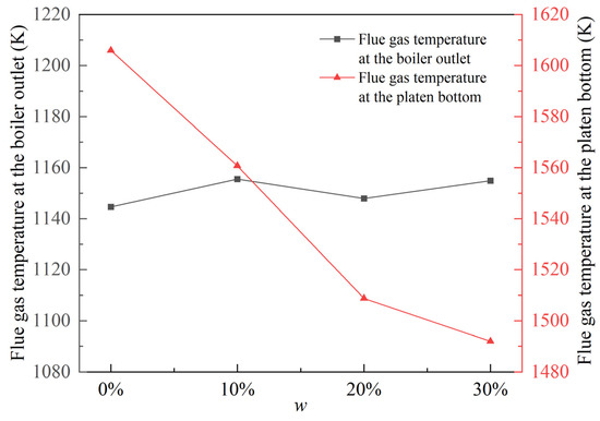 With the increase in w, although the flame temperature in the furnace declines, the temperature at the boiler outlet remains relatively stable, as shown in Figure 10. When w increases from 0 to 30%, the flue gas temperature at the boiler outlet only fluctuates between 1144.6 and 1155.5 K, with a maximum deviation of 10.9 K. This means that the overall efficiency of the boiler remains relatively unchanged. However, the flue gas temperature at the platen bottom experiences a noticeable decrease. It decreases from 1605.9 to 1491.9 K. This trend is consistent with findings in the literature [37]. The changing trend of these two quantities indicates that as w increases, the heat absorption of the water-cooled wall decreases, while the heat absorption of the superheater and reheater increases. However, the overall sum of these two heat absorptions remains relatively unchanged.
