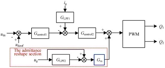 On the basis of voltage and current dual-loop control and the active damper equivalent admittance, the control section adds an admittance reshaping section to enhance the admittance flexibility. Additionally, the active damper admittance except for the admittance reshaping section is minimized, which is controlled by adding a filter on the controller input side (GLPF1 and GLPF2), as shown in Figure 4. GLPF1 and GLPF2 are designed by considering the resonant distribution in the frequency range. The control strategy mainly responds to harmonic components outside the fundamental and low frequency, avoiding their impact on the system operation state. The admittance reshape section mainly responds to harmonics which have a higher frequency than that of the resonance to reduce its impact on the system’s operating state.