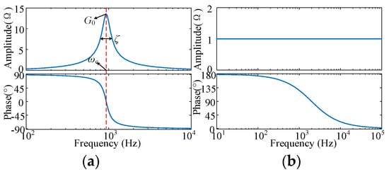 The distribution characteristics of the second-order transfer function Bode diagram are shown in Figure 5a, which mainly adjusts the frequency–amplitude curve of Grs. As shown in Figure 5a, the reshaped admittance has a relatively small impact on the admittance outside the resonant frequency range, the characteristic frequency ωc is usually the resonant frequency to a single resonant peak, and the admittance amplitude distribution can be shaped by adjusting the gain G0 and damping coefficient ζ. The lead-lag link provides more phase flexibility for Grs, as shown in Figure 5b, whose amplitude variation of the Bode diagram in Figure 5b is small, and the phase changes within the range of 0–180°. Combined with the gain G0, Grs can reshape the admittance within the range of 0–360° by adjusting the time constant T based on the phase distribution characteristics of the resonance suppression domain.