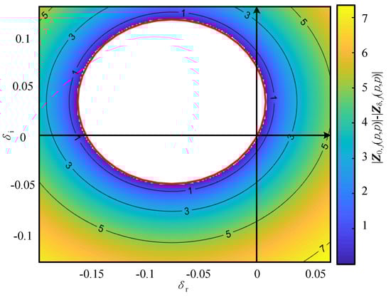 To further illustrate the distribution characteristics of the resonance suppression domain, taking the 551.3 Hz resonance frequency of node 2 as an example, the real and imaginary parts of admittance change δ corresponding to the x and y axes, respectively, and the resonance suppression degree of the self-impedance at 551.3 Hz under different δ is shown in Figure 7. The white area in the figure is the resonance amplification area.