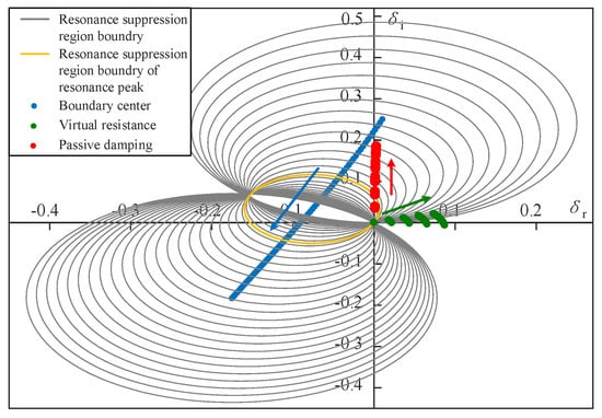 From Equation (9), the boundary of the resonance suppression/amplification is a circle centered with the real and imaginary parts of −1/Z0,f(p,p) and the corresponding mode value as the radius. The outer region of the circle is the resonance suppression region, whose criterion is shown as Equation (9). The boundary of the resonance suppression domain always passes through the origin.