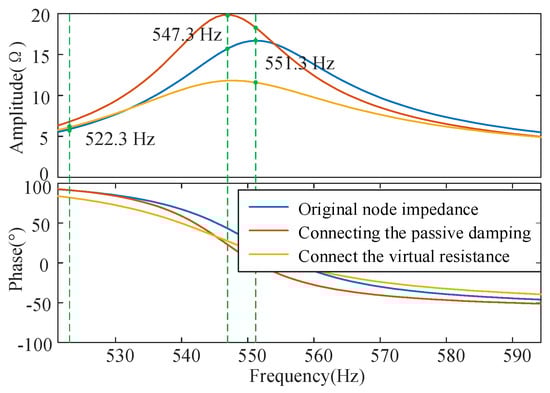 Taking a virtual resistance of 0.03 Ω and a passive damping with a resistance of 0.01 Ω and capacitance of 10 μF as examples, the node impedance before and after its connection was shown in Figure 9. It can be seen that the connection of passive damping leads to resonance frequency transfer and impedance amplification. The connection of virtual resistance effectively reduced most of the impedance in the frequency range but still played a resonance amplification role on some frequencies, which is consistent with the analysis results in Figure 8.