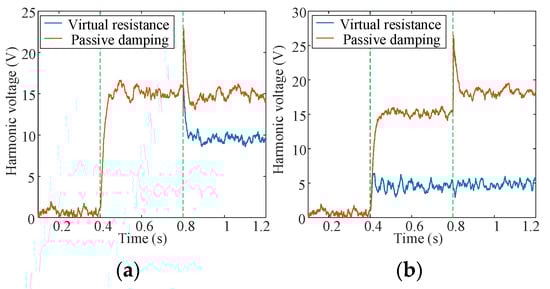 To verify the above phenomenon, a 1A disturbance current is injected into node 2 at 0.4 s through simulation, and a virtual resistance of 0.03 Ω and a passive damping with the resistance of 0.01 Ω and capacitance of 10 μF are connected at 0.8 s, respectively. The response of the node 2 harmonic voltage is shown in Figure 10.