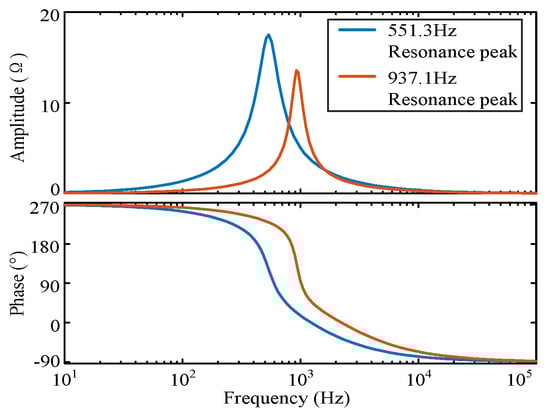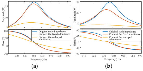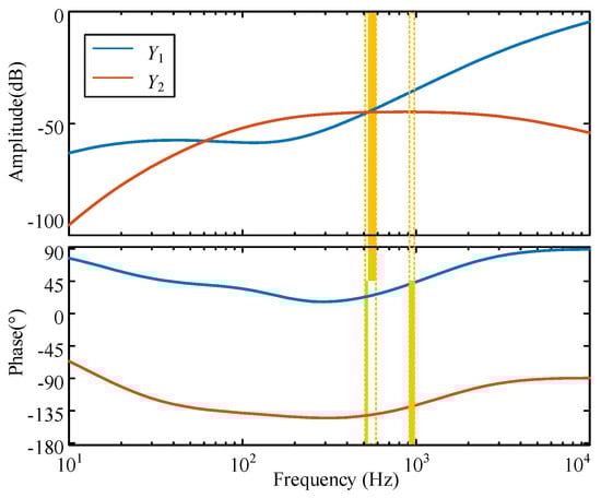 (2) Reshape admittance design and application: According to the reshaped admittance design method in Section 3.2, the reshaped admittance parameters corresponding to the two resonant frequencies are shown in Table 4, and the Bode diagram is shown in Figure 13.