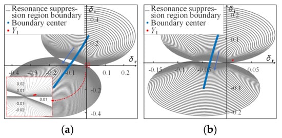 The resonance suppression domain of Grs can be derived from Section 3.1. To make sure the Grs resonance suppression domain boundary still always passes through the origin, let Y1 in Equation (14) serve as the self-admittance, which is located in the corresponding position of the node admittance matrix. Then, δr + jδi = Y2Grs in Equation (9). In that case, the center of the Grs resonance suppression domain boundary is
