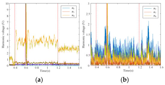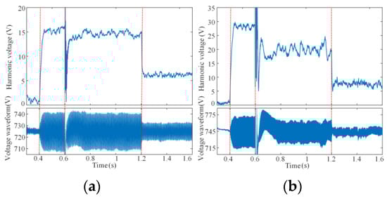 Further verification is conducted on the PSCAD/EMTDC simulation. A 1A disturbance current corresponding to the resonant frequency is injected into node 2 and node 1 at 0.4 s, respectively, the active damper is connected to the corresponding nodes at 0.6 s, and then reshaping admittance sections are connected at 1.2 s. The harmonic voltage waveforms are shown in Figure 16a,b.