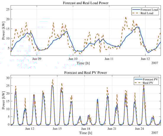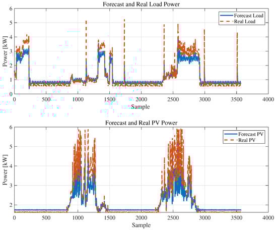 The validation process evaluates the quality of the predictions using a closed-loop system. In other words, the network states are initialized with 1440 data from the validation set (equivalent to 1 full day), and the remaining data in the set are predicted from this information. Consequently, the validation predictions reached an RMSE of 0.3189 kW for the PV power and 0.6170 kW for the demand. Figure 4 depicts the data adjustment of the predictor, and although there are slight differences between the actual data and the forecast, the trend is similar. Furthermore, although the predictor operates within the proposed EMS, the LSTM network will constantly update its memory states for each prediction.