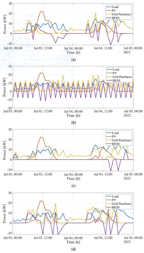 Lastly, Figure 7d illustrates the fourth comparative case, the original development of the authors. It combines the optimization-based algorithm with the condition-based one. The distinction lies in that once the current scenario is determined along with the state of the BESS, the set points for each device are calculated by solving the optimization problem. The notable feature of this algorithm is the charging of the BESS during periods of scarcity of renewable resources, resulting in increased energy purchases from the primary distribution system.
