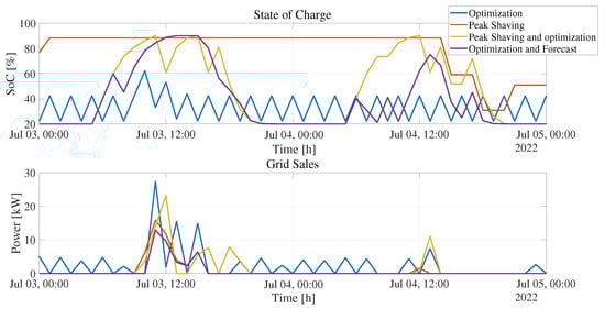 Figure 8 shows the time series related to the SoC of the energy storage system and the sales made to the grid system. In the case of the EMS solely based on an optimization algorithm, it becomes apparent that the energy stored at a given time is immediately sold in the subsequent period. This action has a pronounced impact on the SoC because of the constant cycling of the battery. On the other hand, the peak-shaving algorithm has a lesser impact on the SoC, as it only utilizes the available energy in the BESS in specific consumption circumstances. In contrast, optimal algorithms that focus on peak shaving and prediction (proposed in this work) have a lower impact on the SoC. They perform a controlled charging and discharging process that aligns with periods of high solar availability (charging) and resource scarcity (discharging). Furthermore, the sale of energy only occurs when charging the battery or meeting the demand is not feasible.