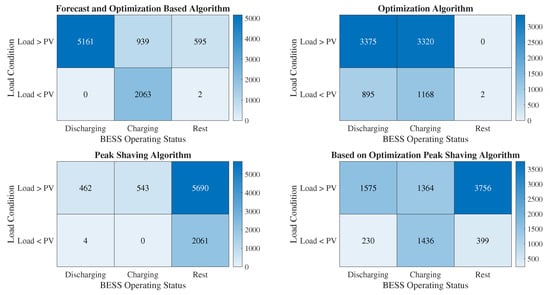 However, performance over only two days is not representative of behavior over an entire year. Therefore, Figure 9 shows heat maps illustrating the frequency with which the battery engages in dispatch decisions, considering the demand and available solar resources throughout the year (8760 h). Thus, the proposed algorithm uses the battery approximately 59% of the time to meet demand when the renewable resource is scarce. On the other hand, about 24% of the time is allocated to storage, specifically when there is a surplus of renewable energy compared to consumption. About 6% of the time, the battery engages in storage processes even when the solar resource is lower than the load. This action is directly related to the predictive component of the algorithm. In such cases, the algorithm predicts that the power purchased in time would be higher than that purchased in time t, prompting the choice of battery charging. Finally, 11% of the time, the BESS goes into idle mode because it reaches the maximum SoC limits. Therefore, it does not allow charging or discharging under any consumption condition. When these metrics are compared with those of other algorithms, it becomes evident that the proposed algorithm achieves a higher effective integration of the batteries. For example, in algorithms with a focus on peak shaving, batteries spend more time in a resting state than contributing to demand coverage, accounting for only 18% of the time.