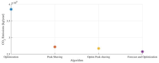 Another result of interest is the amount of emissions generated by each EMS when operating the microgrid. Figure 10 shows that the proposed technique produces 25,766 kg/year of , demonstrating a reduction of at least 3. 58% compared to the peak-shaving approaches and an impressive 33% compared to the pure optimization approach. These results highlight the importance and effectiveness of the proposed technique in minimizing greenhouse gas emissions. This achievement can be directly attributed to the planned storage of excess photovoltaic energy, which was made possible by the accurate forecast provided by the LSTM network. The ability to anticipate and efficiently manage surplus energy contributes to the reduction in emissions, thus consolidating the environmental and sustainable relevance of the proposed approach.