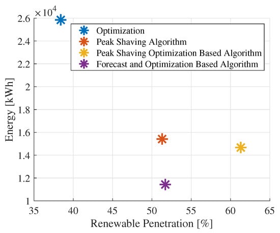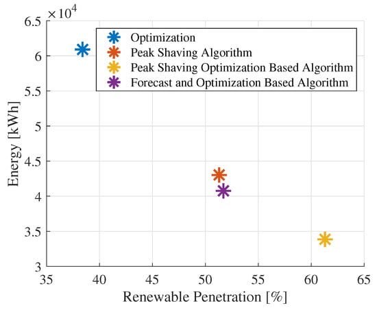 In a different context, the economic aspect is also crucial for evaluating the performance of an algorithm. Therefore, Figure 11 and Figure 12 depict the amount of energy purchased and sold to the primary grid compared to the penetration level of renewable sources in each algorithm. In this context, the proposed algorithm achieves 52% integration of photovoltaic energy, with a purchase of 40,770 kWh/year and sales of 11,435 kWh/year. Therefore, it is the algorithm with the second-highest integration of renewable energy, surpassed only by the peak-shaving approach, which achieves 62% renewable integration. However, it is essential to note that the integration percentage is measured on the basis of the load covered solely by renewable energy, without considering the BESS. As a result, since photovoltaic power is surplus most of the time it is available, the load is covered by this energy, and the remaining power is sold to the grid. However, according to the time-series data, it is evident that these two metrics favor the algorithm with low battery usage. Despite this, with greater integration of the BESS, the proposed algorithm only results in about a 20% increase in purchases from the grid. Furthermore, there is no dispatching of excess solar energy, as most of it is stored to meet demand in other instances, consequently leading to a considerable reduction in energy sold to the grid.