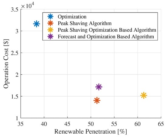 In Figure 13, the annual operating cost is compared to each algorithm’s renewable penetration level. In this aspect, it becomes evident that the operating cost decreases as the percentage of renewable penetration increases. Consequently, the proposed algorithm has the third-lowest operating cost at USD 17,149, which is 22% higher than that of the peak-shaving algorithms. It is essential to note that this cost difference is insignificant when considering two crucial factors: the significantly higher integration of batteries in the proposed algorithm compared to the other three techniques, and due to this higher integration, the use, maintenance, and replacement of the BESS contribute to the operating cost of the microgrid. Additionally, the peak-shaving algorithm does not consider the self-discharge effect of the battery. According to the heat map presented in Figure 9, the BESS can retain stored energy for several days without loss, which is unrealistic and could lead to significant power losses. Consequently, the benefit of this EMS for the microgrid in this case study translates into a greater integration of the storage system into energy management without exerting an aggressive impact on its charging cycle, which reduces the costs associated with the operation, maintenance, and replacement of the BESS.
