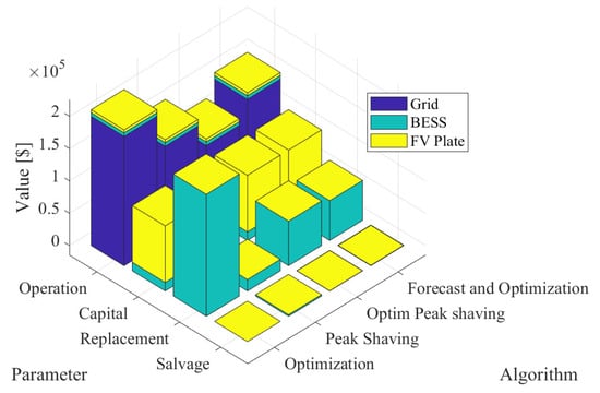 Figure 14 summarizes the costs associated with the capital, replacement, operation, and benefits of the microgrid components, considering a project duration of 25 years. The capital cost is identical in all four cases since the microgrid uses the same architecture. The BESS represents a significant investment at a cost of USD 13,200, together with the photovoltaic panels costing USD 87,500.