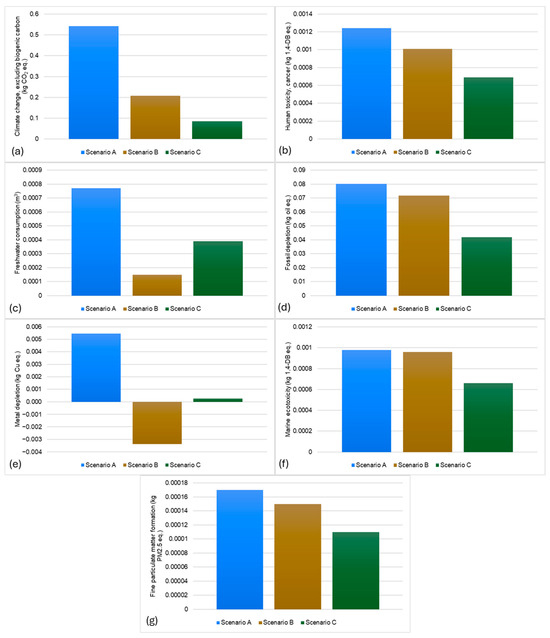 | Impact Category (×10−3) | Scenario A | Scenario B | Reduction in Scenario B (%) | Scenario C | Reduction in Scenario C (%) |