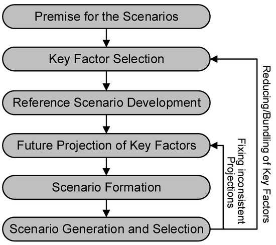 To select the final and most consistent combination out of the candidate’s pool, the Consistency Value (CV) and Total Impact Score (TIS) function as the evaluation criteria [30]. The TIS means the sum of the impact scores of all selected scenario variants. The CV is the parameter to evaluate if the chosen combination of the factors is consistent. In the case of a positive or zero CV, the combination is accepted as consistent [67,68]. Based on the scenario selection criteria, the final scenarios are determined. All scenarios have a CV equal to 0 and the highest TIS out of the possible candidates, so they involve the most consistent combination.