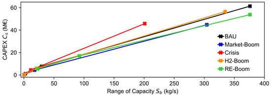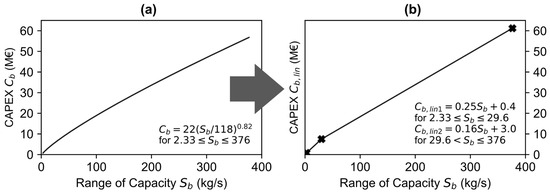 CAPEX functions of WGS plant in BAU-scenario: (a) cost function through capacity method Cb, (b) linearized cost functions Cb,lin (adopted and modified from [42]).