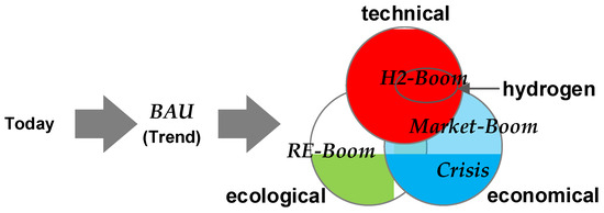 The reference scenario, often referred to as the “trend scenario”, operates on the assumption that no new measurements will be made by the target year [38,39]. The chosen scenario technique for this purpose is trend extrapolation [38]. This scenario is referred to as “Business as usual” (BAU). The current values are derived from well-established and reliable knowledge. Extrapolations in the target years (2040 for operating time and 2025 for investing time) are suggested by a meta-study of different reports about energy and chemical market development scenarios. If reliable development is unavailable, the assumptions are made through trend analysis. It is carried out by collecting historical data for as long as possible, and past trends are extended to the future [38].