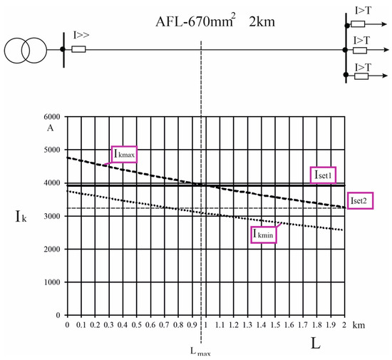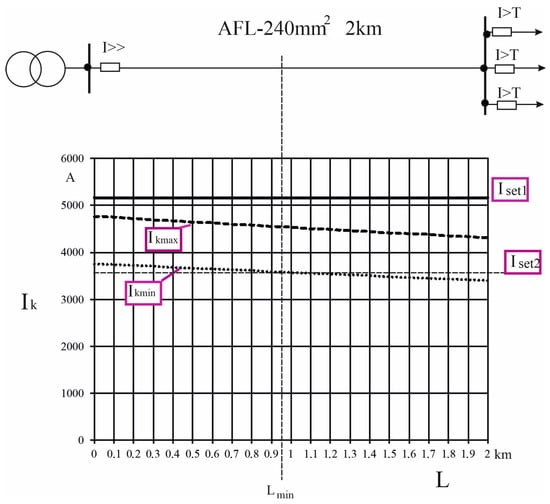 kmax curve denotes the graph of the maximum short-circuit current along the line (i.e., during a three-phase short circuit and the highest short-circuit power on the busbars); and the I