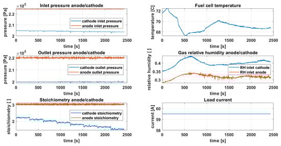 Some models have proposed the combination of static and dynamic fuel cell behavior for prognosis purposes []. Also, in order to simplify the high non-linearity of fuel cell analytical expressions, there are linearized parameter-varying models []. PEMFC dynamics have also been modeled using equivalent electric circuits []. There has been extensive research on developing physics-based models of the PEMFC and its auxiliary systems, with several degrees of accuracy and computational cost [].