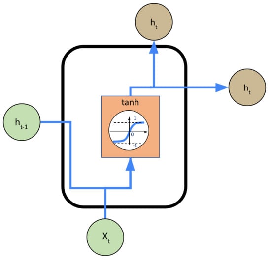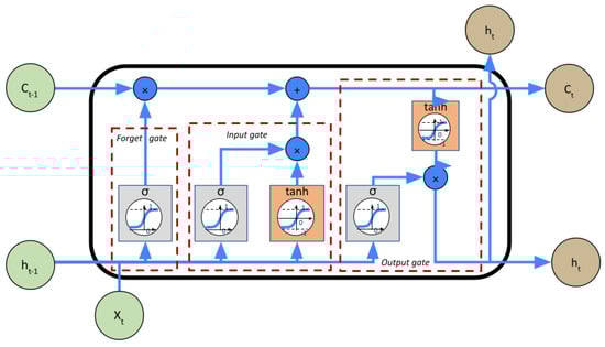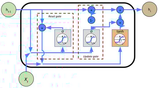 In order to complete the information provided by the physics-based model, a data-driven model was used in parallel. The interest of this structure is to adjust the predictions made by the physical model by using the data-driven model to use historical data and capture more complex dynamics that are difficult to represent. The data-driven model is based exclusively on historical data. The computation is made by an IA algorithm. The challenges are finding the best tool to catch the dynamics of the variable evolution with a low computational effort, the setting of the algorithm parameters and the quality of the data available for the training step. One of the best-known data-driven algorithms dedicated to the forecasting task is the recurrent neural network (RNN). Indeed, they allow the capturing of temporal information at different scales, which make them suitable for this forecasting task. However, classical optimization methods such as back-propagation do not provide good performances and can lead to vanishing gradient problems, where the derivative calculated for some network weights becomes so small that no change is made between epochs [,]. Another possibility is to use long short-term memory (LSTM) [] or gated recurrent unit (GRU) [] networks. The architecture of these networks helps to preserve the error that can be back-propagated through time and layers. LSTM cells are composed of three gates, which are input, output and forget gates. They allow the keeping or erasing of the information stored in the memory. The input gate represents new information added to the cell state, the forget gate decides what information is to be stored or deleted, while the output gate corresponds to the output of the LSTM. The principle of GRU cells is very similar to that of LSTM. The input and forget gates are simplified to an update gate, and a reset gate is used to control how much past information is to be forgotten. Since the architecture of GRU cells is simpler than that of LSTM, they are more computationally efficient. According to the empirical study in [], GRU cells are more attractive when the sequence is long and the datasets are small. In other scenarios, the performance losses compared with LSTM are more serious. Figure 3, Figure 4 and Figure 5 present the principle of the three cells.