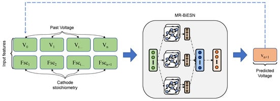 The main objective of the designed approach is to predict the future voltage of a PEMFC using past voltage and current. In order to reduce the computation time and also the training time (including the time needed to find the right combination of parameters), the use of a MR-BiESN seems to be a relevant choice. Indeed, as explained in the previous section, setting the parameter values to obtain good results needs both time and skills, as it is carried out by a trial and error approach or by an optimization tool. Furthermore, in the case of multiple dynamics to catch, the final set is a compromise to obtain the dominant one. An alternative is the use of multiple tanks, in parallel or in series, instead of a single large one. The parameters of the several subtanks are sorted in the usual range of values: the neuron dynamics of the relevant subtank are amplified and the dynamics of the irrelevant ones are extinguished during the training of the ESN. In the designed model, three bidirectional reservoirs are used in parallel. The parallel organization allows detection of the different dynamics contained in the data. Each reservoir is set to detect a type of dynamics (low, medium or fast). The data-driven architecture is presented in Figure 6 and selected parameters are described below and summarized in Table 3.