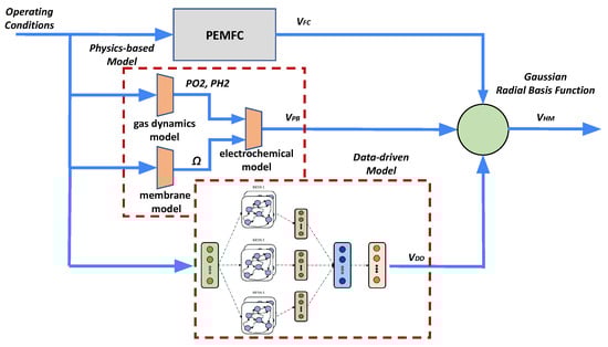Fuel cells are promising energy conversion devices in a future hydrogen-based economy. However, issues such as efficiency and durability must be addressed, and the way of addressing them is by optimal the control of fuel cell operating conditions. The performance of such control depends largely on efficient and accurate models. This paper has proposed and tested a novel hybrid, data-driven/physics-based model for approximating fuel cell output voltage. The two models are merged through a recursive Gaussian radial basis function. The hybrid model has been trained, validated and tested with an experimental dataset, with dynamical profiles in operating conditions.