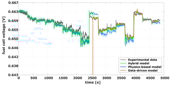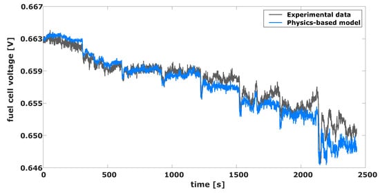 Figure 9 presents the results of the physics-based model. It can be seen that, even though the difference between the real and modeled voltage is in the range of fewer than ten millivolts, the model fails in following the trends and short-term dynamics of the voltage signal.