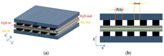 Jiao et al. [23] developed a three-dimensional model for an SOEC, taking into account the co-electrolysis of water and carbon dioxide, as well as internal reforming reactions and multi-component diffusion. They proposed a novel porous material flow-field design, which was compared with the three traditional multi-channel flow-field configurations (i.e., parallel, serpentine, and parallel–serpentine). Their predicted results indicated that the novel design utilizing porous material instead of the conventional rib–channel configuration can reduce the voltage loss during the electrolysis operation. Ni et al. [24] introduced and numerically examined several discretely distributed ribs using 3D multi-physics modeling techniques. In comparison to the traditional straight-through IC design, the discretely distributed ribs achieved a more even distribution of O2 in the SOFC cathode, which resulted in an increase in the peak power density for up to 27.86%. Costamagna et al. established an SOFC model based on experimental data and predicted the temperature distribution and electrochemical performance along the stack radius under low fuel utilization. After confirming the reliability of the model under low hydrogen utilization, the mechanical stress of the SOFC ceramic materials under high hydrogen utilization was determined by the temperature gradients [25]. Xu et al. conducted a numerical comparative study on planar SOECs with co-flow, counter-flow, and cross-flow configurations to analyze the effects of flow patterns on gas distribution, current density distribution, and temperature distribution [26].