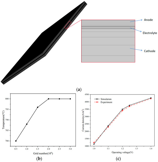 (a) Generated meshes; (b) grid independence testing performance; and (c) predicted I–V curves compared with the experimental data.