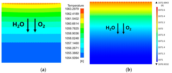 It is demonstrated in Figure 10a,b that the distribution of the predicted temperature along the electrolyte surface is similar to the one at the operating voltage of 1.4 V for both width ratios investigated, as found previously in Figure 6, i.e., the temperature increases along the main flow direction. For instance, the lowest temperature is approximately 850 °C in the inlet, while the highest one is approximately 883 °C, observed in the outlet, i.e., the temperature is increased by approximately 35 °C from the cell inlet to the outlet for the width ratio of 5/2. Meanwhile, this temperature difference (between 842 °C in the outlet and 819 °C in the inlet) is approximately 23 ℃ for the width ratio of 2/5 under the same operating conditions. In other words, the inter-connector configuration (such as the rib/channel ratio) strongly impacts the highest and the lowest temperatures, as well as the difference between them.