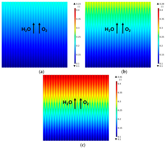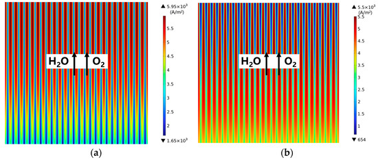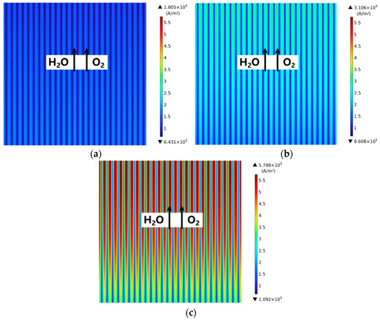 Figure 4 demonstrates the predicted electrolysis current density. It is found that the lowest current density appears in the entrance region, which increases along the main flow direction, and the highest value is reached in the outlet region. Meanwhile, the current density predicted under the ribs is higher than that under the channels. The current density increases as the operating voltage increases, as observed in Figure 4b,c compared with Figure 4a.