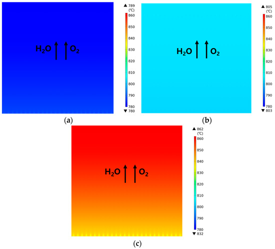 Figure 6 presents the predicted temperature distribution for various operating voltages. It is noted that there is a small temperature difference between the ribs and the channels, particularly in the entrance region at the three operating voltages. It is also seen, in Figure 6a, that the temperature decreases along the main flow direction from the inlet, which is mainly due to heat consumption by the electrochemical reactions. Meanwhile, in Figure 6b the predicted temperature remains relatively constant, with only 2 °C of the temperature variation along the main flow direction when the operating voltage is at 1.3 V, which is evidence that the cell is operated at the thermoneutral voltage (i.e., the balanced heat generation and consumption under this thermally neutral operating voltage). It is also believed that this 2 °C temperature variation results from the heat generated by resistance to the electron flow. On the other hand, the predicted temperature increases along the main flow direction, with the minimum value being even higher than the inlet temperature of 800 °C, as shown in Figure 6c for the operating voltage being 1.4 V (above the thermoneutral voltage). Meanwhile, its maximum value is approximately 30 °C higher than its lowest one, because the heat generation due to various aspects is stronger under the operating condition above the thermoneutral voltage.