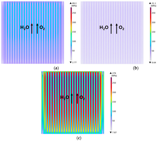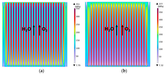 The effect on the von Mises stress is investigated and analyzed for the channel configuration with the gradient ribs/channels. As shown in Figure 17, the minimum stress occurs in the corner regions of the cell, which is approximately 5 MPa varied among the cases studied. The maximum von Mises stress is 512 MPa in case-3, while its value is approximately 343 MPa in case-2, which results in an approximately 170 MPa difference (or about 1.5 times higher) in the maximum thermal stress generated in case-3.