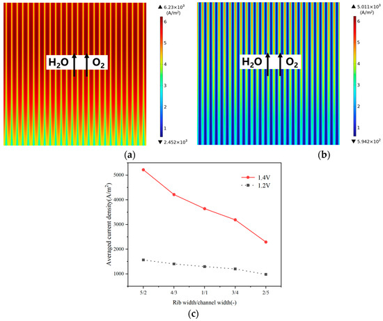The current density is also further predicted for identifying the width ratio effects. As shown in Figure 8c for the operating voltages of 1.2 V and 1.4 V, the averaged current densities decrease if the width ratio decreases, which is the same as observed for the base-case in Figure 8a,b. It is also a fact that the change of the rib/channel width ratio has a greater effect on the predicted current density at the operating voltage of 1.4 V.