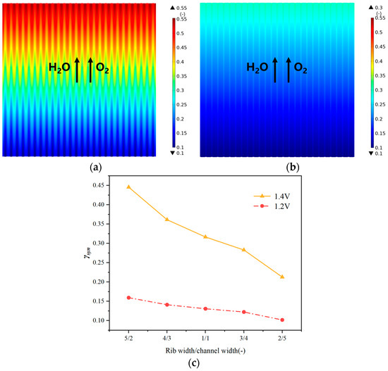 The effects of the rib/channel ratio on the electrolysis performance have been investigated. It is demonstrated in Figure 9a,b that the distribution of the generated H2 mole fraction is also similar, as found previously in Figure 5, i.e., the H2 mole fraction increases along the main flow direction from the inlet for both ratios studied. Figure 9c shows the predicted hydrogen production affected by different width ratios under two working voltages. With decreases in the rib/channel width ratio, the net H2 yield γ (defined as ratio of moles of H2 produced per mole of input H2O) is observably decreased, particularly for the operating voltage at 1.4 V. For instance, only half (i.e., 50%) of the net H2 yield is obtained for the width ratio of 2/5 compared with that for the width ratio of 5/2 at the operating voltage of 1.4 V, while it is reduced to approximately 63.8% at the operating voltage of 1.2 V. Similar to that predicted for the average current density shown in Figure 8c, the electrolysis performance is improved by 40.8% when the rib/channel width ratio is increased to 5:2 from 1:1. This is so because the improved electrical conductivity and enlarged contacting area between the ribs and electrodes caused by the wider ribs can provide higher current density to drive the electrochemical reactions.