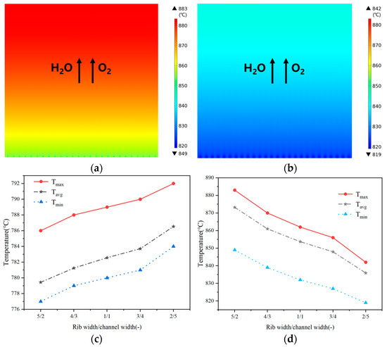 It is also found in Figure 10c that the highest temperature, the lowest temperature, and the averaged temperature are all increased when the rib/channel width ratio decreases under the operating voltage of 1.2 V, because the reduction in the rib width may increase the resistance to the electron flow and weaken the electrochemical reaction, leading to a reduction of the current density and the required heat. It is also a fact that all predicted temperatures are below the gas inlet temperature (i.e., 800 °C), as found in Figure 10c. As seen from Figure 10d, the highest temperature, lowest temperature, and averaged temperature are above the gas inlet temperature (i.e., 800 °C) and decrease as the rib/channel width ratio decreases under the operating voltage of 1.4 V. In other words, the temperature approaches 800 °C as the rib/channel width ratio increases. The average temperature lies between the highest and lowest temperatures but is closer to the lowest one at 1.2 V, as shown in Figure 10c, which indicates that the proportion of the lower temperature area is larger. However, the averaged temperature is closer to the highest temperature at 1.4 V, as shown in Figure 10d, which shows that the proportion of the higher temperature area is larger. It is interesting to note in Figure 10c that the temperature difference between the highest in the inlet and the lowest in the outlet is less than 10 °C throughout all width ratios; however, in Figure 10b it can be seen that this value between the highest temperature in the outlet and the lowest one in the inlet is enlarged to more than 30 °C for all the investigated width ratios if the operating voltage increases to 1.4 V. In other words, the temperature difference in the electrolysis cell is mainly affected by its operating voltage, rather than the inter-connector configuration (such as the rib/channel width ratio).