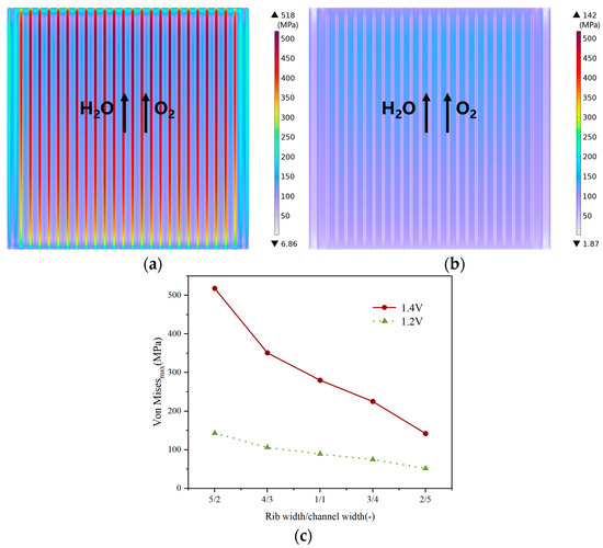 The distribution of von Mises stress at 1.4 V with rib/channel width ratios of (a) 5:2, (b) 2:5; and (c) the effect of rib/channel width ratio along the electrolyte surface.