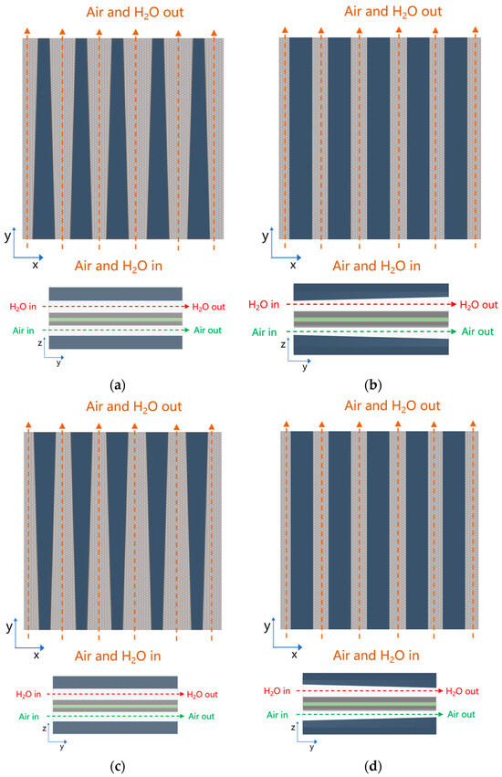 A repeating unit cell of SOECs is selected and modeled, as shown schematically in Figure 1a, and it consists of (i) anode inter-connector with the air channels, (ii) positive electrode–electrolyte–negative electrode assembly, or PEN for short, (iii) cathode interconnector with the H2O channels. The co-flow pattern that is normally used is also employed. In this study, five rib/channel width ratios are investigated for understanding the impact of the rib/channel size on both the electrochemical and thermal performance of the SOEC, as displayed in Figure 1b. The SOEC geometric parameters for the base-case (i.e., rib/channel width ratio = 1) are displayed in Table 1, while four types of gradient channel are also proposed for the cell configurations to investigate the impact on both the electrochemical and thermal performance of the SOEC, as presented in the latter sections.