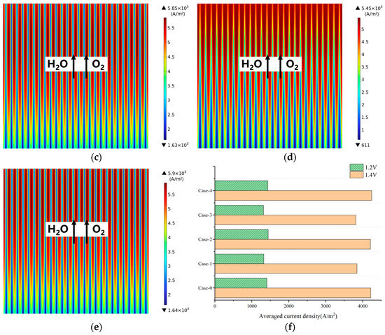 The current density distribution obtained in case-4 (Figure 13e), with the channel shrinking in the thickness direction, is almost the same as that for case-2, as shown in Figure 13c. Figure 13f shows the averaged current density predicted for various cases, and it can be seen that the overall difference is rather small, especially at the operating voltage of 1.2 V, which is mainly due to the small change in the total contacting area between the ribs and the electrode in the specific cases investigated.