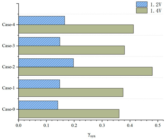 The effect of the gradient channel configuration and geometry parameters on the electrolysis performance is investigated and presented by the net H2 yield γ (defined as ratio of moles of H2 produced per mole of input H2O), as shown in Figure 14. It can be seen that the hydrogen production is improved to a certain degree when the new channel configuration is adopted. Overall, the influence of the channel geometry parameters changing in the thickness direction (i.e., case-2 and case-4) on the hydrogen production performance is more obvious than that in case-1 and case-3, with the channel gradient in the thickness direction. For instance, for case-2, the hydrogen production performance is significantly improved by 30% at 1.4 V, which is the best case in terms of the electrolysis performance, and the hydrogen production performance is only improved by 4.0% and 5.4% for case-1 and case-3, respectively.