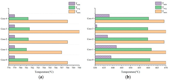 As shown in Figure 15a, there is no obvious change in the highest, lowest, or averaged temperatures at the electrolysis operating voltage of 1.2 V when the gradient channel configuration is adopted, with the maximum difference being approximately 3 °C. Meanwhile, the difference becomes slightly larger if the cell is operated at 1.4 V, as shown in Figure 15b. For instance, the lowest temperature obtained in case-3 is approximately 10 °C lower than that in case-1 (see Figure 15b), which is affected by the reduced but evenly distributed current density shown in Figure 13b. It is also noted that the largest difference in the highest and the lowest temperatures is approximately 40 °C, identified for case-3 in Figure 15b, while it is only approximately 10 °C in Figure 15a for the same channel configuration, if the operating voltage increases from 1.2 V to 1.4 V. In other words, the cell temperature difference between the highest and the lowest values becomes four times larger if the operating voltage is shifted from below to above the thermoneutral state for the extreme cell configuration in case-3.